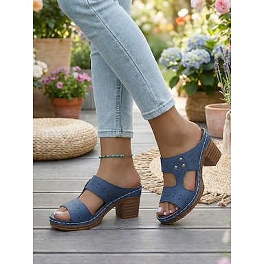 Blå damsandaler med utskurna remmar, bekväma sandaler med tjock blockklack för avslappnade sommarpromenader och resor &vardagskläder