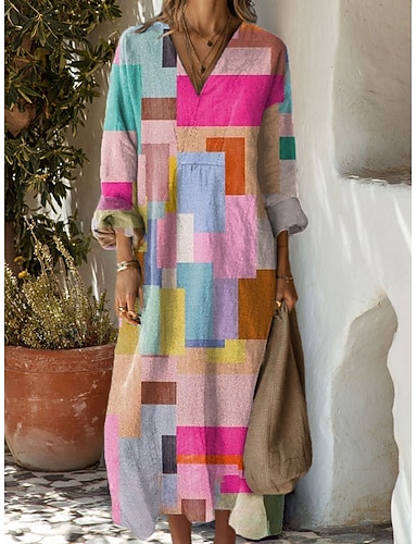 Dam Midiklänning Solklänning Vardagsklänning A linjeklänning Semester Ledigt Boho Strand Fest Helgdag Lös passning Grafisk Geometrisk Långärmad V-hals Blå Rodnande Rosa Orange Sommar Vår Höst