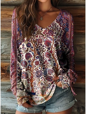 Damernas Boho T-shirt Långärmad Blommig Grafisk Växter Vintage Stilren Avslappnad Långärmad V-ringad Vanliga Toppar Daglig Helgtryck Salviagrön Rosa Röd Lila Grön Vår Höst Förhöst