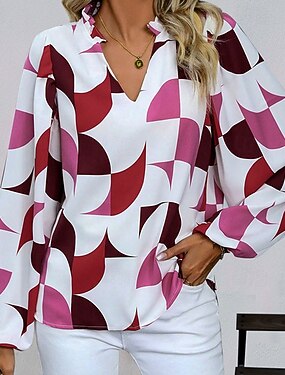 Dam Skjorta Draperad Geometrisk Slät Elegant damer Stylish Långärmad Puffärmad V-hals Vanliga toppar Dagligen Arbete Utekväll Svart Vin Vår Höst