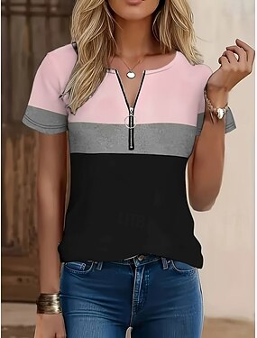 Dam T-shirt Färgblock Fjärdedels blixtlås Grafisk Randig Tropisk Hawaiisk Stylish Kortärmad Rund hals Vanliga toppar Strandbröllop Dagligen Sport Blå Aska Rodnande Rosa Sommar Vår