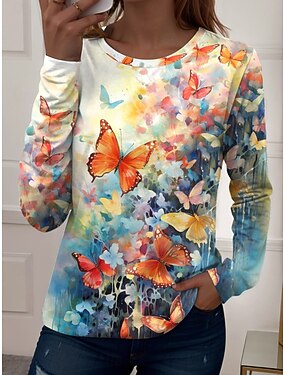 Dam T-shirt Crew Neck Långärmad Tunika Grafisk Fjäril Växter Vintage Stilig Casual Vanliga Toppar Daglig Weekend Utskrift Gul Blå Lila Höst