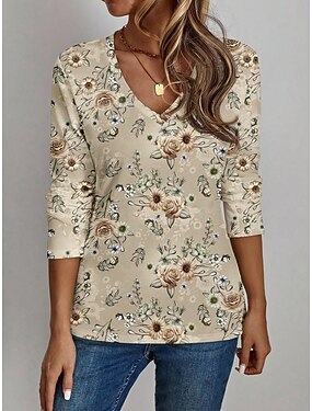 Dam T-shirt Mönster Blommig Grafisk Växter Vintage Stylish Klassisk Långärmad V-hals Vanliga toppar Dagligen Kaki Vår Höst