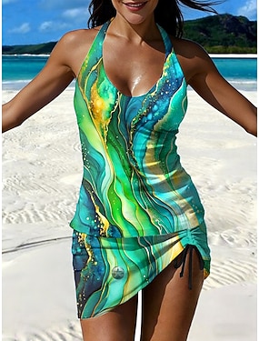 Dam Badkläder Tankini Kjol Baddräkt Elegant Semester Grafisk Geometrisk Halterneck Ärmlös Baddräkter
