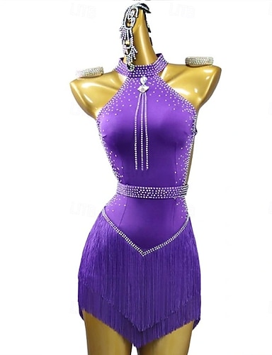 Latinamerikansk dans Klänning Strass Tofs Dam Prestanda Träning Ärmlös Hög Elastan Tyll