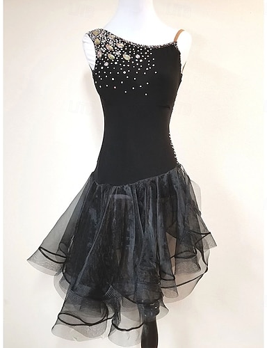 Svart latinamerikansk dansklänning för kvinnor med kristaller och strassdetaljer och lager-på-lager-tyllkjol för salsa, tango och uppträdandekläder