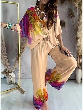 Dam Byxuppsättningar Bolero Top 3/4 ärm V-hals Blommig Mode Streetwear Ledigt Dagligen Utomhus Beige Vår Lös passning