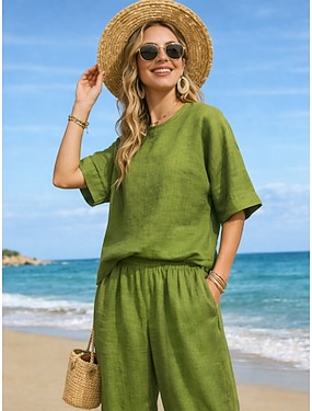 Dam Tvådelade set T-shirt Konstbomullslinne Linne Byxor Kortärmad Ensfärgat Vit Orange Grön Sommar Normal