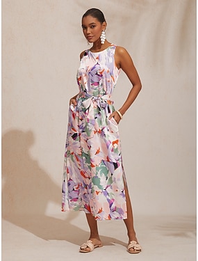 vårblommande silkeslen, rynkad rosa sommarmaxiklänning