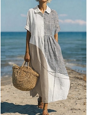 Dam Maxiklänning Linneblandning Elegant bohemliv Semester Helgdag Lös passning Geometrisk Kortärmad Tröjkrage Grå Sommar Vår