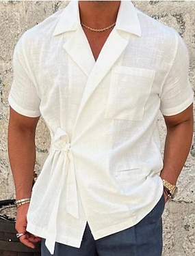 Herr Linneskjorta i bomull Vit bomullsskjorta Sommarskjorta Strandskjorta Slät Semester Hawaiisk Svart Vit Kaki Kortärmad Kavajslag Vår & sommar Kläder Ficka