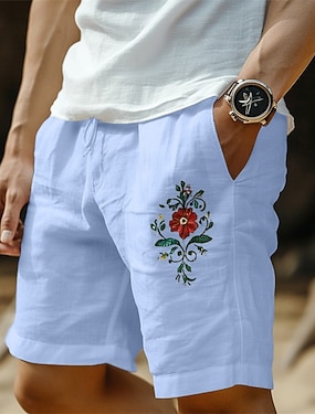 Herr Shorts Linne Shorts Sommarshorts Beach Shorts Snörning Elastisk midja Grafisk Blommor Mjuk Andningsfunktion Knelängd Utomhus Ledigt Dagligen Semester Streetwear Svart Vit Microelastisk