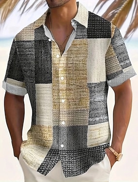 Herr Geometrisk Rutnät / Pläd Skjorta Knapp upp skjorta Kortärmad Mode Casual Utomhus Semester Streetwear Sommar Vår Nedvikt 3D-utskrift krage skjortor Svart Rodnande Rosa Armégrön Blå Grön