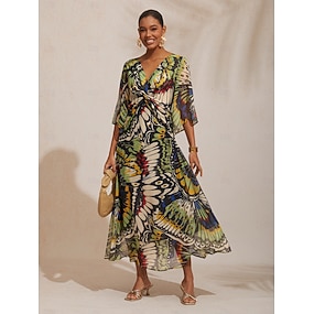 kvinnors bröllopsgäst cocktailklänning chiffong vanlig volang vriden elegant sommar maxiklänning v-ringad utsvängd 3/4 lång ärm
