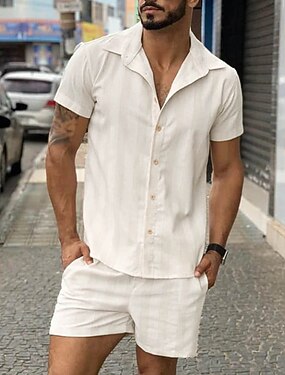 Herr Skjorta linneskjorta Linneskjorta i bomull Vit bomullsskjorta 2 delar Skjorta set Kaki Kortärmad Slät Kavajslag Vår & sommar Hawaiisk Helgdag Kläder Ficka