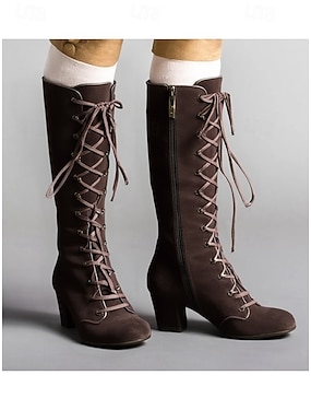 svarta knähöga kängor med snörning för kvinnor – vintage chunky klack stövlar i konstmocka för höstens vintermode