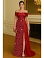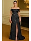 A-linje Golvlång Kvälls klänningar Balklänning med överkjol Formell klädsel Elegant Hög split Kortärmad Över axeln Formell Bröllop Satäng med Glitter Veckad Kristalldetaljer 2025