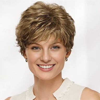 mörkbrun blandad blond peruk brun med höjdpunkter pixie cut peruker för vita kvinnor med lugg kort vågig syntetisk peruk naturligt äkta hår julfest peruker