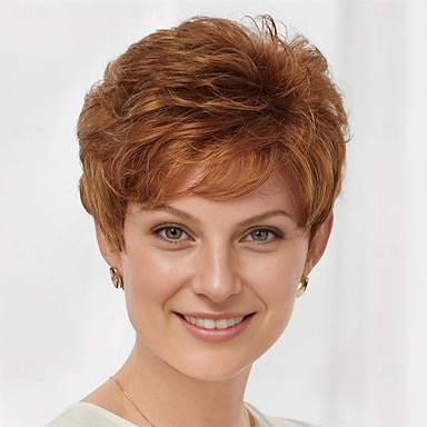 whisperlite peruk korta volymrika lager av mjuka fjäderiga vågor/multitonala nyanser av blond silverbrunt och rött