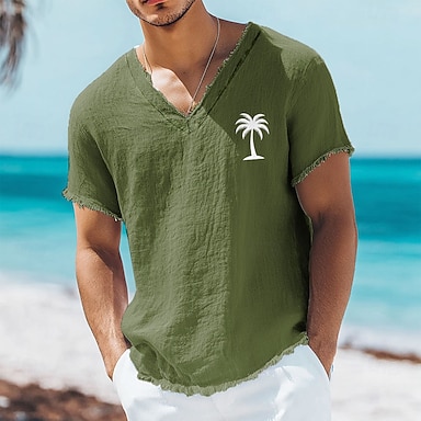 Herrtröja med palmträdstryck, linne- och bomullsblandning, v-ringad, rå kant, sommar, strandsemester, kortärmad, fransig, mjuk, avslappnad, modedesignertopp, s-3xl