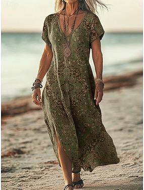 Dam Maxiklänning Boho-klänning Vardagsklänning A linjeklänning Klänning med tryck Vintage Utomhus Strand Semester Normal Blommig Grafisk Kortärmad V-hals Ljusrosa Gul Ljusgrön Armégrön Sommar Vår