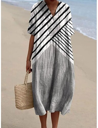 Dam Midiklänning Solklänning Semester Ledigt Strandstil Dagligen Utekväll Lös passning Grafisk Rand Kortärmad V-hals Aska Sommar