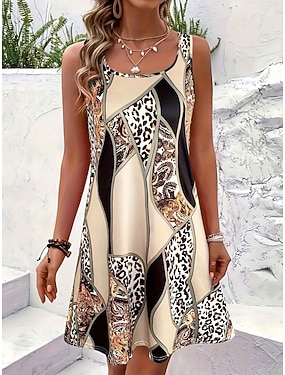 Dam Knälång klänning Solklänning A linjeklänning Sommarklänning Semester Ledigt Boho Strand Fest Bröllop Normal Grafisk Leopard Geometrisk Ärmlös U-hals Gul Rubinrött Orange Beige Sommar Vår