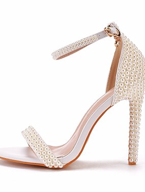 Pärlprydda brudsandaler med hög klack och fotledsrem för kvinnor, eleganta brudskor med öppen tå för brudar, lyxiga pärldekorerade klackar för ceremoni &mottagning