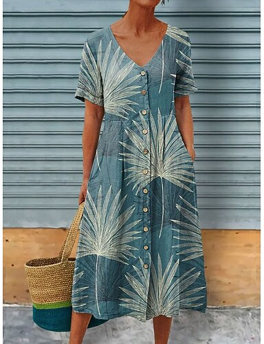 Dam Midiklänning A linjeklänning Semester Ledigt Boho Normal Blommig Grafisk Kortärmad V-hals Blå Orange Grön Beige Sommar Vår