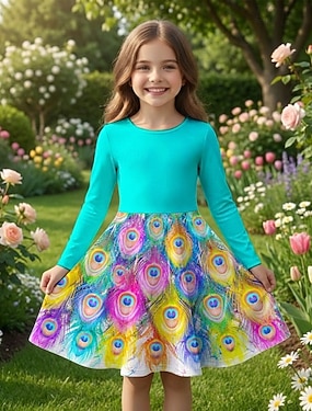 Flickor 3D Grafisk Påfågel Klänning Långärmad 3D-tryck Vår Höst Dagligen Semester Fest Ledigt Prinsessa Skön Barn 4-12 år Vardagsklänning A linjeklänning Knälång Normal