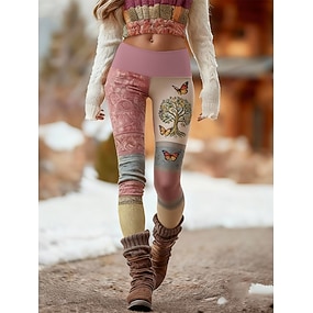 Dam Viking Damasker Mysiga leggings Semester Vintage Etnisk Stil Fullängd Hög midja Träd Fjäril Tryck Bekväm Elastisk Ledigt Dagligen Semester Rodnande Rosa Vår Höst Smal passform