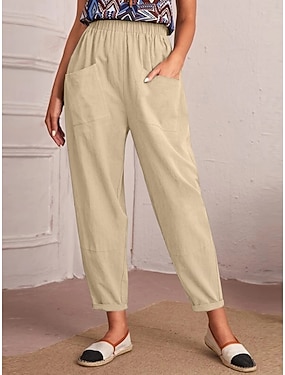 Dam Konstbomullslinne Casual byxor Sommarbyxor Rak Semester Grundläggande Ledigt Fullängd Hög midja Ensfärgat Slät Ficka Elastiskt midjeband Bekväm Mjuk Andningsfunktion Elastisk Dagligen Utomhus Gata