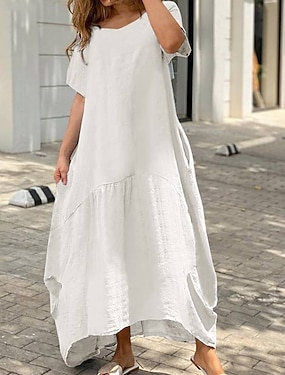 Dam Maxiklänning Konstbomullslinne Skiftklänning Vit klänning Sommarklänning i bomull Ledigt Dagligen Semester Utekväll Lös passning Ren färg Kortärmad Rund hals Svart Vit Gul Rodnande Rosa Sommar Vår