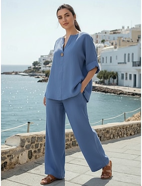 Dam Skjorta Set med bomullslinne Tvådelade set Linne Byxor Kortärmad Ensfärgat Blå Marinblå Grå Sommar Normal