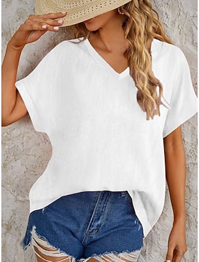 Dam Skjorta Blus Konstbomullslinne Slät Stylish Klassisk Modern Kortärmad V-hals Vanliga toppar Dagligen Helgdag Utekväll Blå Svart Vit Rodnande Rosa Brun Sommar Vår