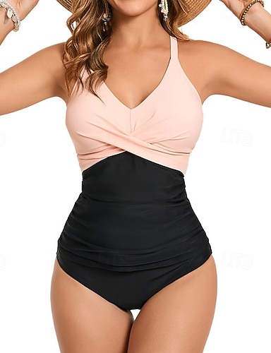 Dam Badkläder En bit Monokini Baddräkt Magkontroll Hög midja Smal Öppen rygg Elegant Semester Färgblock V-hals Ärmlös Baddräkter