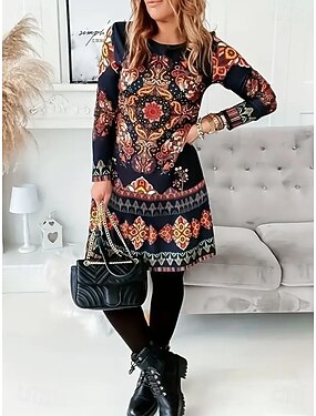 Dam Mini klänning Tröjklänning Semester Ledigt Boho Dagligen Helgdag Utekväll Smal Grafisk Långärmad Rund hals Svart Purpur Orange Grön Höst Vinter