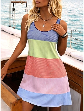 Dam Mini klänning Vardagsklänning Linneklänning Stylish Ledigt Dagligen Lös passning Rand Ärmlös U-hals Blå Purpur Orange Grön Sommar