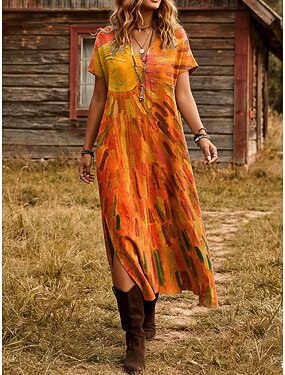 Kvinnors Midi Klänning Boho A-linje Klänning Semester Avslappnad Daglig Lös Fit Blommig Grafisk Kortärmad V-hals Orange Sommar Vår
