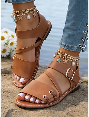 Lätta sommarsandaler för kvinnor - klassiska bruna platta sandaler med fotledsrem för damer, perfekta för strandresor och vardagskläder
