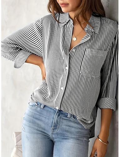 Dam Skjorta Button Down skjorta Casual skjorta Blus Knappar Randig Stylish Klassisk Modern Långärmad Tröjkrage Vanliga toppar Dagligen Helgdag Utekväll Blå Svart Rodnande Rosa Purpur Grön Sommar Vår