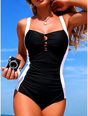 Kvinnors enstycks baddräkt Ruched Sexig Cutout Monokini Mage kontroll Hög midja Slim Baklänges Semester Strandkläder Färgbock V-ringad Ärmlös Baddräkt