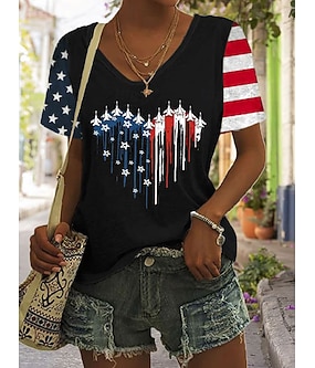 Independensdagen Patriotiska Kvinnors T-shirt Grafisk Flagga Vintage Trendig Klassisk Kortärmad V-ringning Regula Tops Daglig Helgtryck Svart Vit Röd Blå Sommar