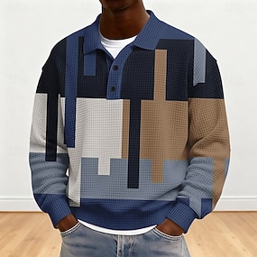 Herr Färgblock Geometrisk Våffelpikétröjor Strukturerad Långärmad Polotröjor Kavajslag Sportkläder Ledigt Skola Fritids- Dagliga kläder 3D-utskrift Höst vinter Blå Brun Grön