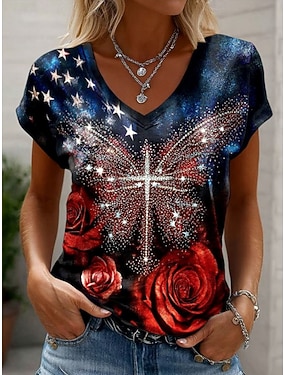Amerikanska självständighetsdagen Dam T-shirt Mönster Blommig Grafisk Amerikanska flaggan Vintage Stylish Klassisk Kortärmad V-hals Vanliga toppar Dagligen Gym Sport Vit Röd / blå Rosenröd Sommar Vår