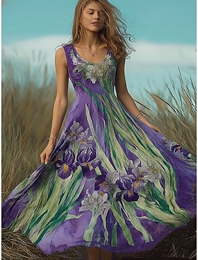 Damernas Maxi Klänning Boho Sommarklänning A-linjeformad Klänning Slip Klänning Plisserad Klänning Semester Avslappnad Strand Vanlig Passform Blommig Grafisk Etnisk Ärmlös U-hals Lila Sommar Vår