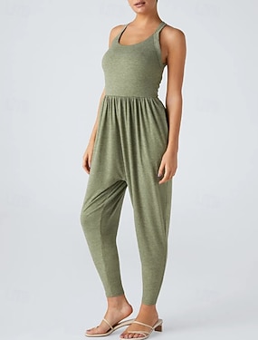 Dam Vanligt Jumpsuits Aktiv Ensfärgat Ärmlös Brett skaft Rund hals Öppen rygg Dagligen Semester Lös passning Rubinrött Ljusbrun Sommar