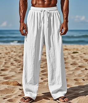 Herr Linne Byxor Långbyxor Sommarbyxor Strandbyxor Snörning Elastisk midja Rakt ben Slät Komfort Andningsfunktion Fullängd Dagligen Helgdag Strand Semester Mode Svart Vit