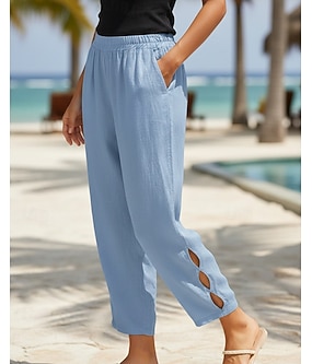 Dam Konstbomullslinne Brett skaft Casual byxor Sommarbyxor Semester Streetwear Grundläggande Fullängd Medium Midja Slät Ficka Mateial som andas Bekväm Oelastisk Dagligen Utomhus Semester Blå Gr