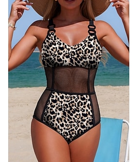 Dam Badkläder En bit Monokini Baddräkt Smal Öppen rygg Semester Standkläder Ensfärgat Leopard V-hals Ärmlös Baddräkter